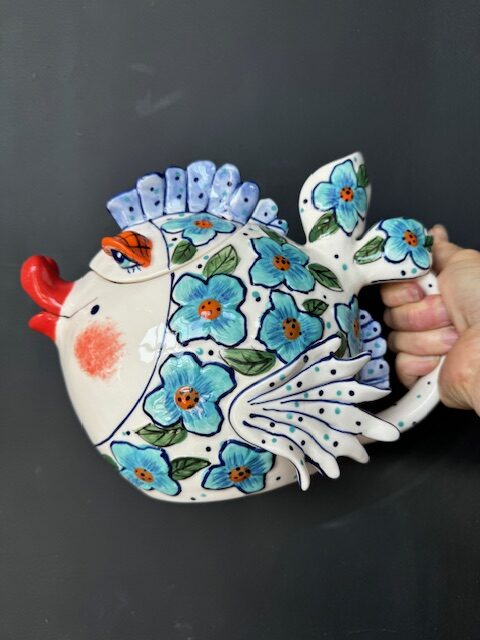 - The Blue Flower Fish Teapot by Blue Sky is the perfect visitor for a relaxing tea. Blue Sky has been making quality ceramics for over 20 years. We’ve lucked onto them, and we love the charm and fun in each piece! These tea pots are limited… we usually only have one of each at a time. So if you find one you love, don’t wait too long. It might not be there the next time you look.