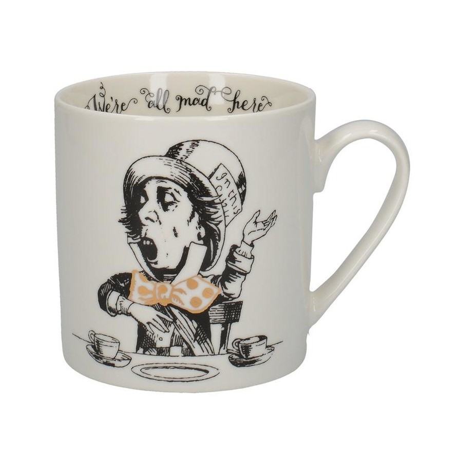 Turn daily coffee breaks in to your very own Mad Hatter’s tea party, by sipping from this lovely white mug, from the Alice in Wonderland collection, by V&A. This fine china coffee mug is decorated with a black and white illustration of the Hatter making a speech at his tea party. He’s dressed in a suit and his signature over-sized top hat, while his bow tie is finished with shimmering gold detail. His declaration ‘We’re all mad here!’ skirts around the inside rim of the mug in a striking, swirly font. The designs are inspired by an Alice in Wonderland card game based on illustrations by Sir John Tenniel (1820 – 1914). Turn the tea mug around and you’ll see the Mad Hatter marching off in to the distance, with his tea cup and sandwich still firmly in hand. And that’s not all! Just like Wonderland, this mug is packed with new surprises at every turn. Finish your drink and you’ll see a small image of the March Hare appear on the base.