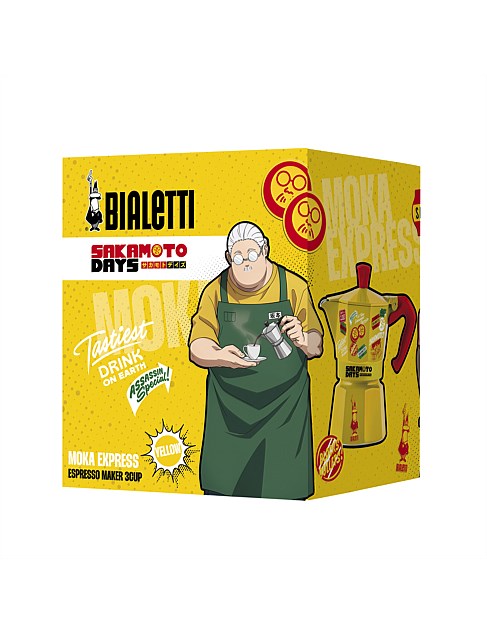 The Bialetti Sakamoto Days Moka Express in Yellow is a 3-cup (130ml) limited edition stovetop coffee maker, combining classic Italian engineering with vibrant Sakamoto Days anime artwork. It features a bright yellow finish with exclusive illustrated designs, serving as both a functional coffee maker and a collector’s item.