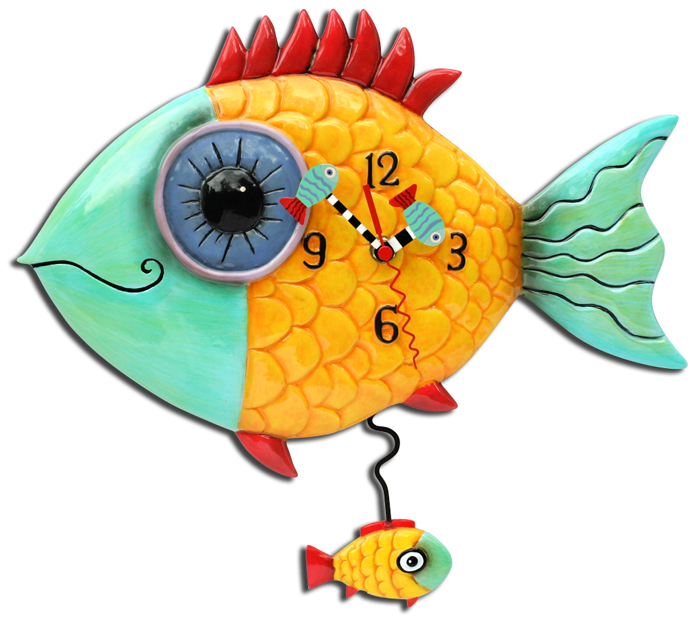 - This brightly colored fishy clock has his own mini fishy pendulum
